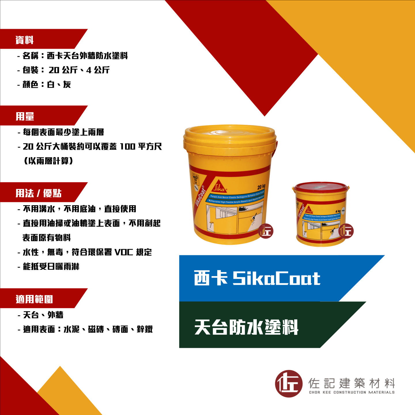 西卡 SikaCoat 天台外牆防水塗料是專業的防水塗料,適用於天台及外牆的表面,使用的時侯不需要剷起已有的物料,直接用油掃或油轆塗上兩層防水塗料,就可以達到專業級防水效果。