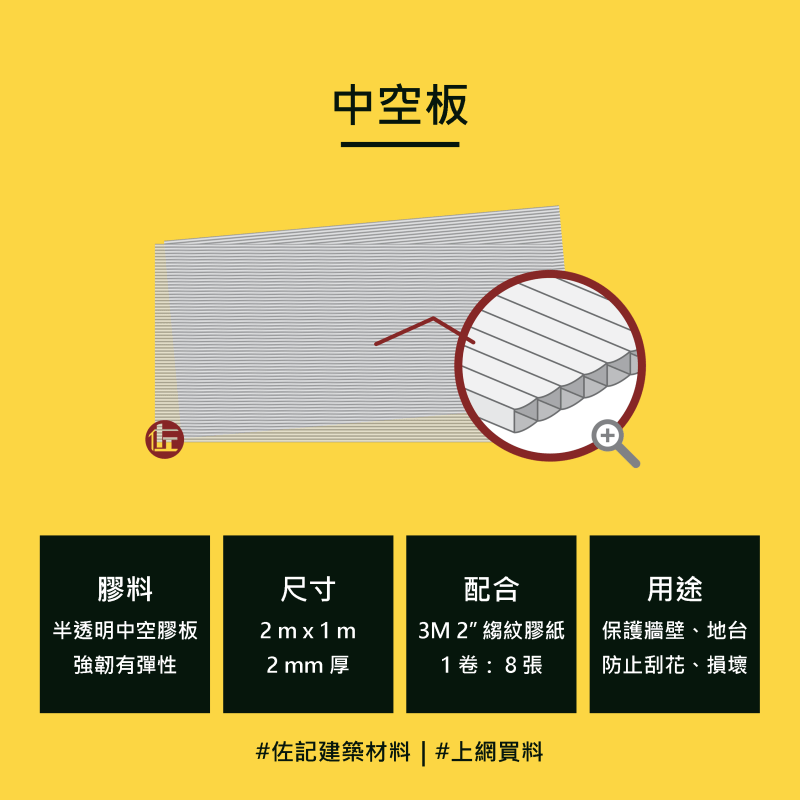 而中空膠板的最佳拍檔就是 3M 2214 縐紋膠紙,易貼、易除只係這種膠紙最基本的特性,穩妥地把中空膠板連貼起來才是它最大的好處。